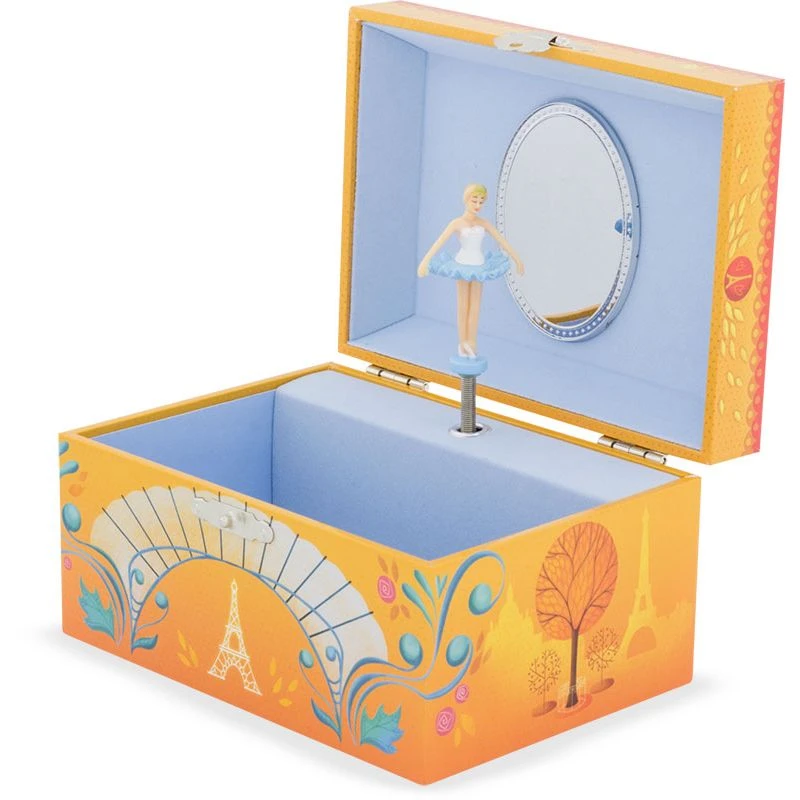 Sur le thème de Paris en automne, cette belle boîte à bijoux musicale accompagnera votre petite fille sur l’air de « A bicyclette » d’Etienne Lorin. Lors de l’ouverture de la boîte à bijoux, la petite danseuse se mettra à danser au son de la mélodie. Le mécanisme manuelle (ne nécessitant donc pas de piles) se trouve au dos de la boîte.