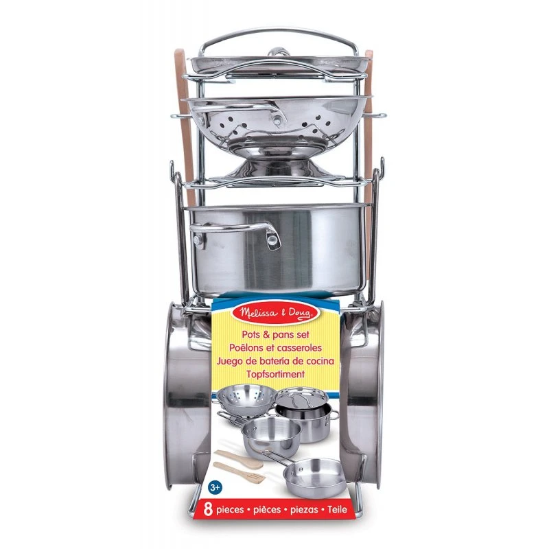 Cette dinette en métal comprend des ustensiles de cuisine en acier inoxydable brillant. Généreusement dimensionné (diamètre de 13 cm) pour un aspect plus réaliste, la passoire et trois casseroles (avec couvercles interchangeables) conviendront aux cuisiniers les plus exigeants !