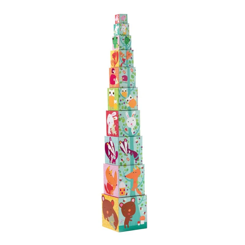 Très jolis cubes pour enfant à empiler sur le thème des animaux de la forêt. L’enfant s’amusera d’abord à faire tomber les cubes que papa ou maman empile patiemment, puis en grandissant il s’amusera à faire lui même des pyramides de plus en plus grandes. Il découvrira les animaux de la forêt et les nombres présents sur les cubes.