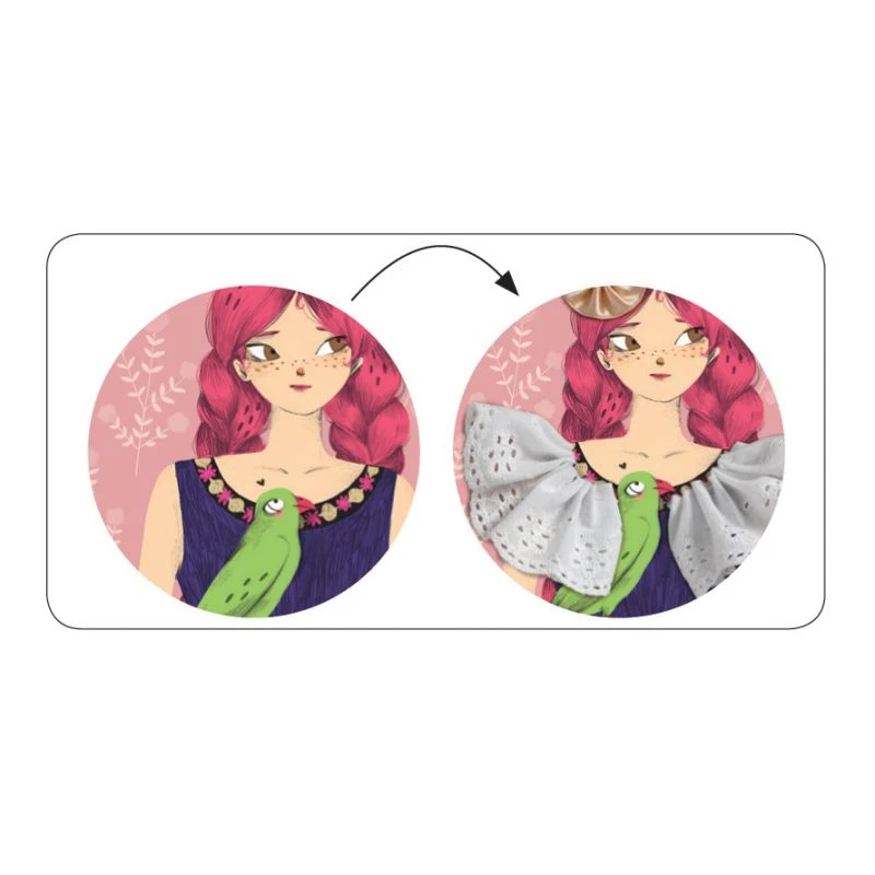 Flamenco de Djeco est un coffret d’initiation à la couture à l’aide de cartes pré-perforées permettant de faciliter le passage de l’aiguille. Il est livré avec des tissus, rubans et dentelles pour créer des vêtements à la manière des stylistes.