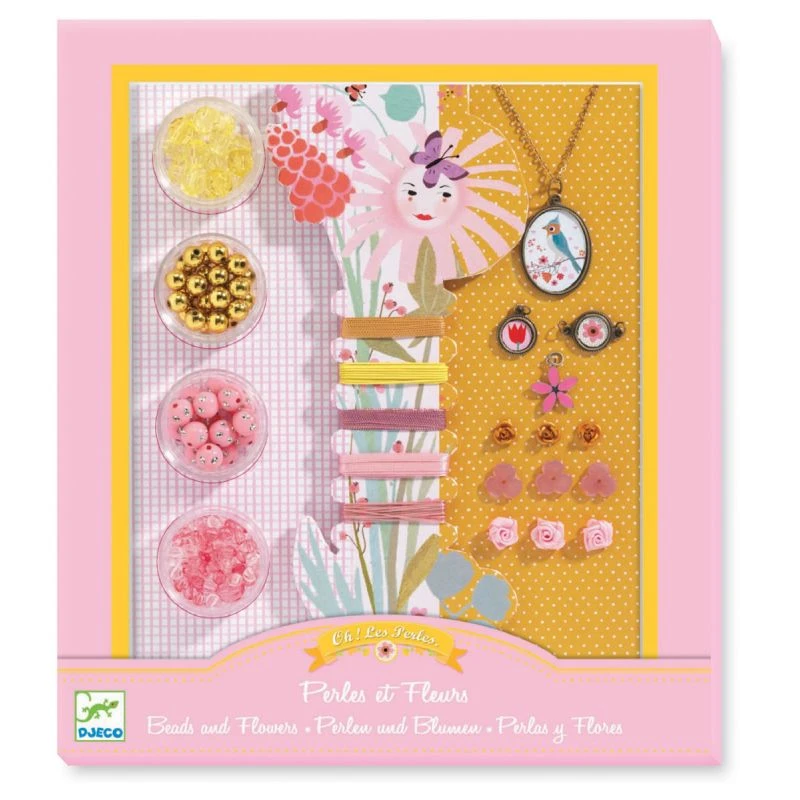Djeco propose un coffret de perles simple et original sur le thème des fleurs. Vous trouverez dans ce coffret 4 boîtes de perles, de rubans et élastiques aux couleurs assorties