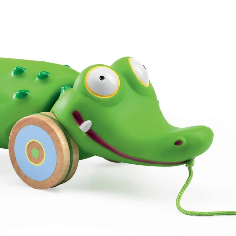 Croc’n’roll est un grand crocodile rigolo. Lorsque bébé le traînera derrière lui en tirant sur la cordelette verte, Croc’n’roll se dandinera frénétiquement. Son corps est en vinyle souple et ses roues sont en bois. Elles sont cerclées d’une bande de caoutchouc afin de ne pas être bruyant.