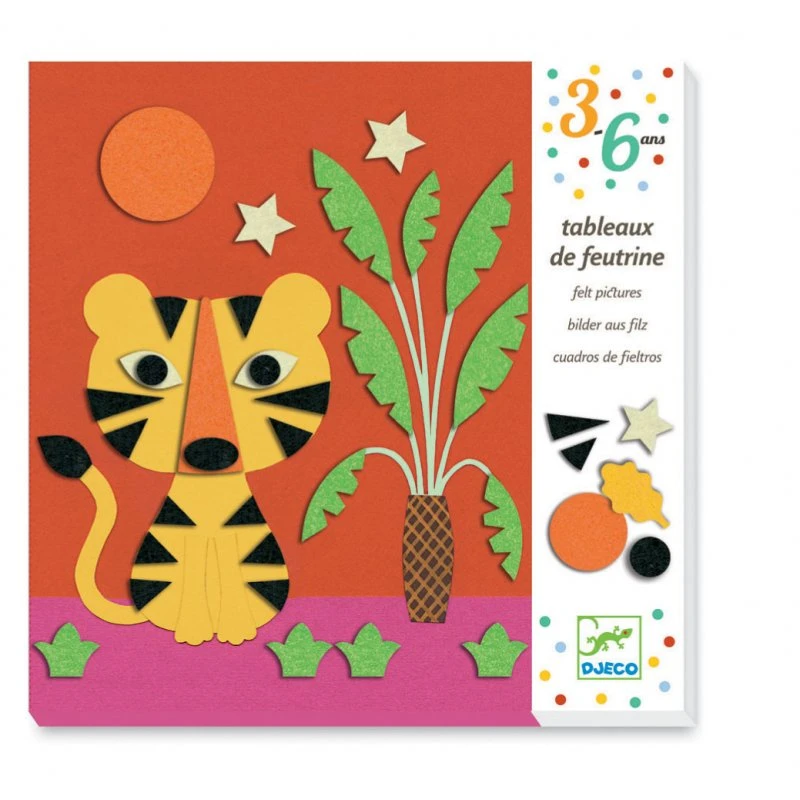 Coffret facile d’utilisation avec ses 4 planches illustrées de 20 x 20 cm, 114 gommettes de feutrine autocollantes et son livret explicatif pas à pas