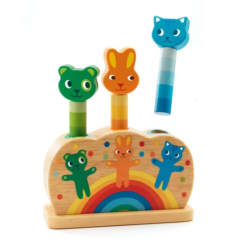 Pipop pidoo est un jeu de pop up simple mais qui rencontre un grand succès auprès des enfants qui prennent beaucoup de plaisir à faire sauter les 3 petits animaux qui sont expulsés en l’air lorsque l’enfant appuie dessus grâce au ressort.