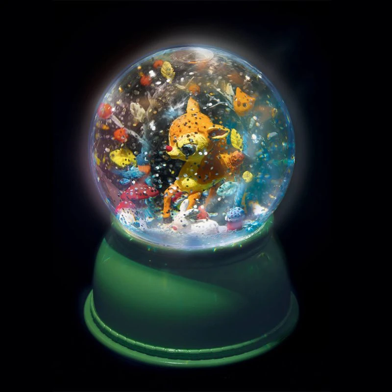 La veilleuse Faon de Djeco est à la fois veilleuse et boule à neige. Cette veilleuse intègre un mécanisme qui en plus d’éclairer avec différentes couleurs va faire tourbillonner les paillettes dans la boule pour offrir un spectacle poétique. Avec les petits oiseaux, les champignons, les arbres décorés de leurs dernières feuilles et la neige tourbillonnant le petit faon semblera plus vrai que nature.
