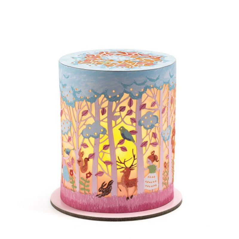 Cette veilleuse forêt magique diffuse une lumière douce au travers du papier ajouré faisant ressortir les dessins d’arbres et d’animaux de la forêt. La veilleuse dispose d’un timer qui permet de l’éteindre automatiquement au bout de 20 minutes.