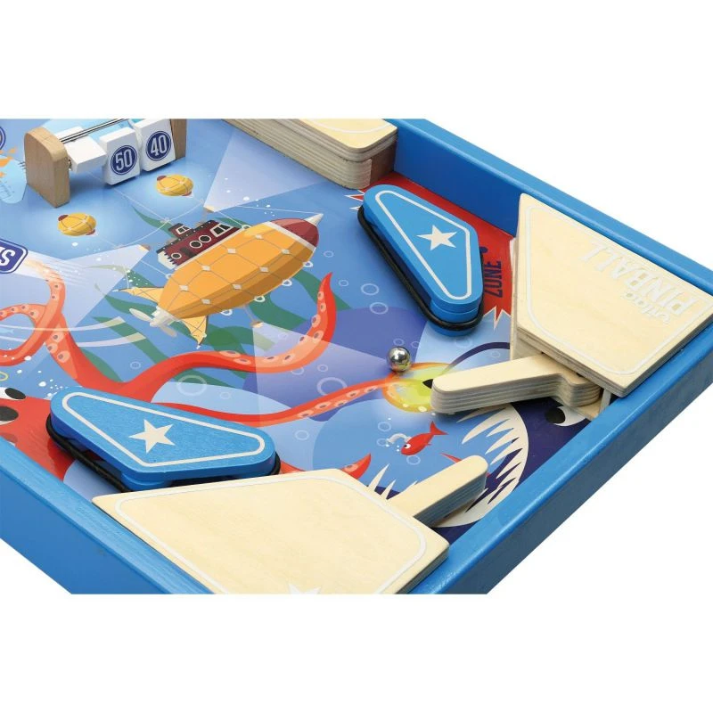 Vilac vous présente son grand flipper en bois Sous la mer. Les enfants découvriront avec joie les bumpers et kickers sur lesquels les billes vont rebondir, les tourniquets avec leur lot de points, les clochettes et même le bonus extra ball.