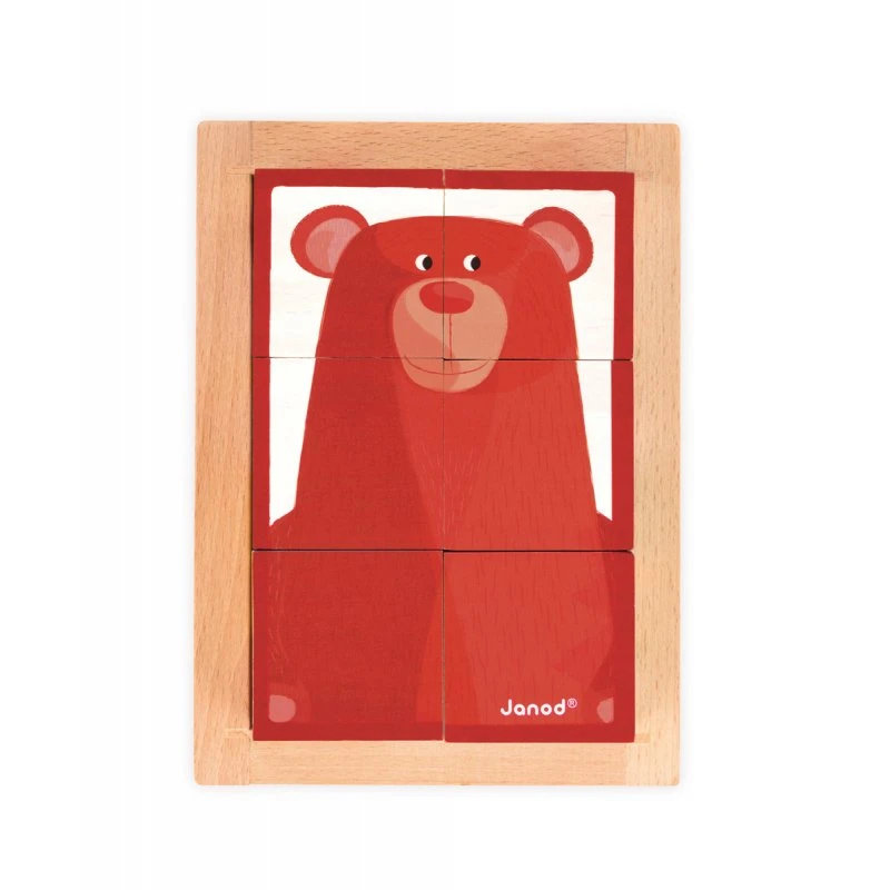Ces 6 cubes en bois représentent de très jolies illustrations de portrait d’animaux (un renard, une chouette, un lapin, un raton laveur, un ours et un élan). Les couleurs différentes sur les bords entre les illustrations guideront l’enfant dans la réalisation de ces puzzles en lui faisant travailler son sens de l’observation.