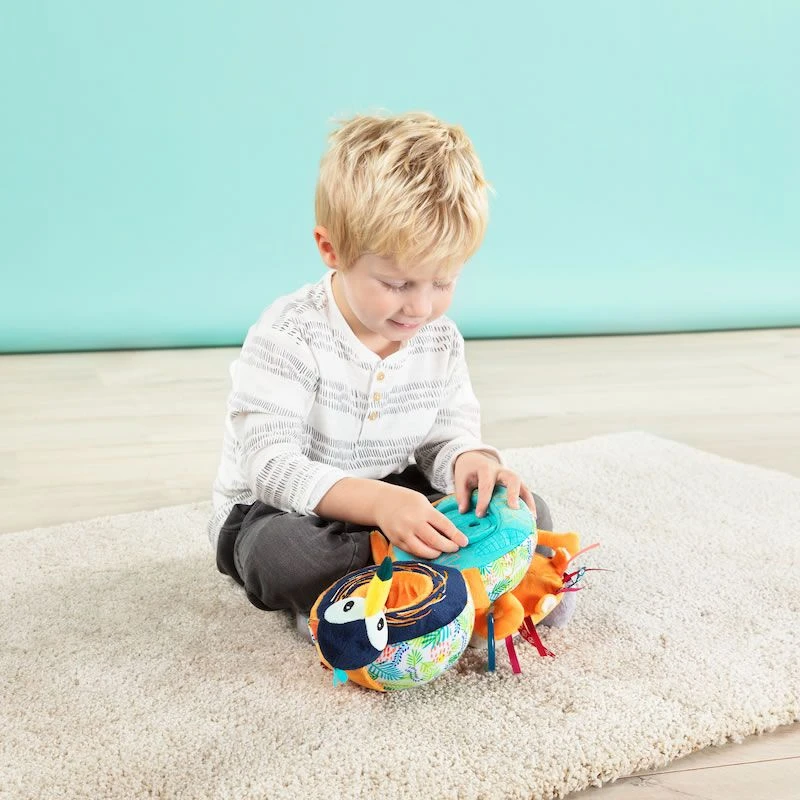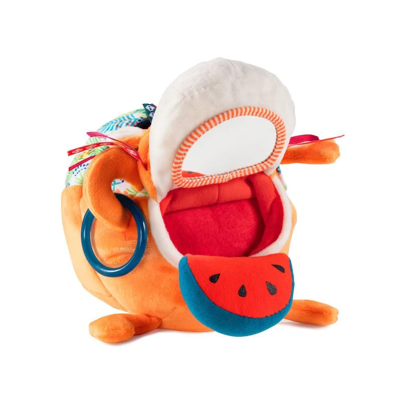 Jack le lion Lilliputiens est un jouet de découvertes qui réserve plein de surprises. Ce jouet polyvalent qui prend la forme d’un lion à la crinière multicolore va stimuler les sens de bébé avec ses différents sons et textures. Dans sa bouche se cache un miroir pour amuser bébé qui découvrira dans son ventre des formes à encastrer ainsi que Georges le lémurien de chez Lilliputiens.