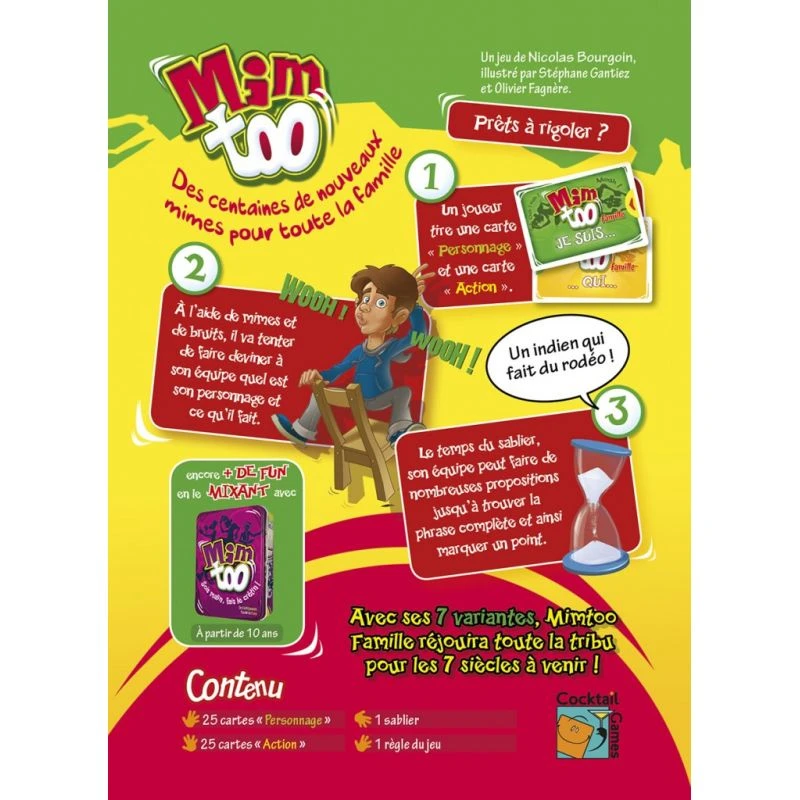 À chaque tour, vous devrez mimer à vos partenaires des scènes très insolites, après avoir tiré une carte dans une pioche « personnage » et une autre dans une pioche « action ». Ainsi arriverez vous à mimer à vos partenaires un indien qui fait du rodéo ou une chèvre qui louche ?