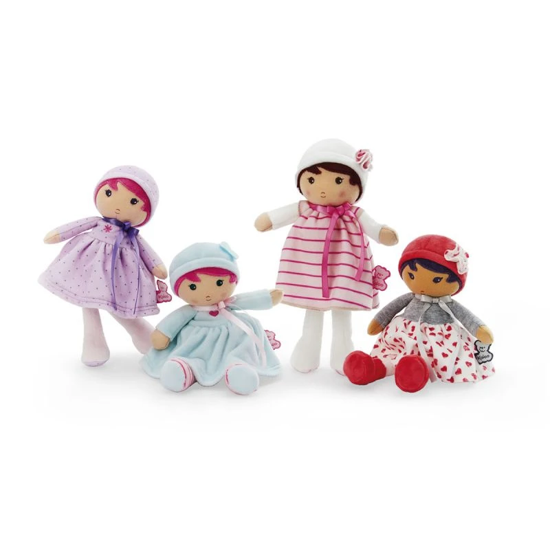 Jade est une ravissante poupée chiffon de la collection tendresse de Kaloo. Cette poupée tissu est la plus romantique des poupées Tendresses. Avec ses bottes et son chapeau rouge, sa belle jupe blanche couverte de petits cœurs, son maillot gris chiné et son petit nœud autour du cou Jade saura conquérir le cœur de votre petite fille.