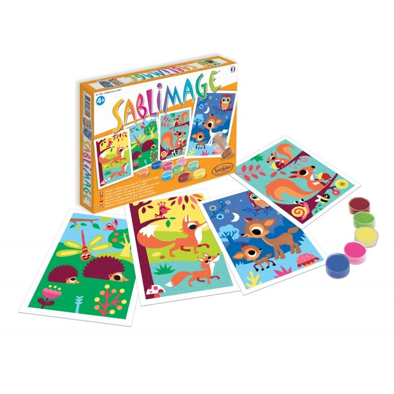 Quatre très beaux tableaux en sables colorés représentant des animaux de la forêt dans leur habitat naturel. Chaque tableau de ce coffret possède des couleurs et des ambiances différentes. Les détails et les illustrations soignées de ce coffret raviront les jeunes artistes.