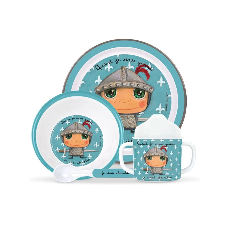 Le set de vaisselle quand je serai grand je serai chevalier est un set complet de repas en mélamine pour bébés et petits enfants. Ce set comprend une assiette plate, un bol, une cuillère et une timbale à poignée illustrés par l’artiste Isabelle Kessedjian avec un chevalier. Il sera parfait pour les premiers repas de bébé Les petites garçons seront contents de se mettre à table pour retrouver leurs chevaliers.