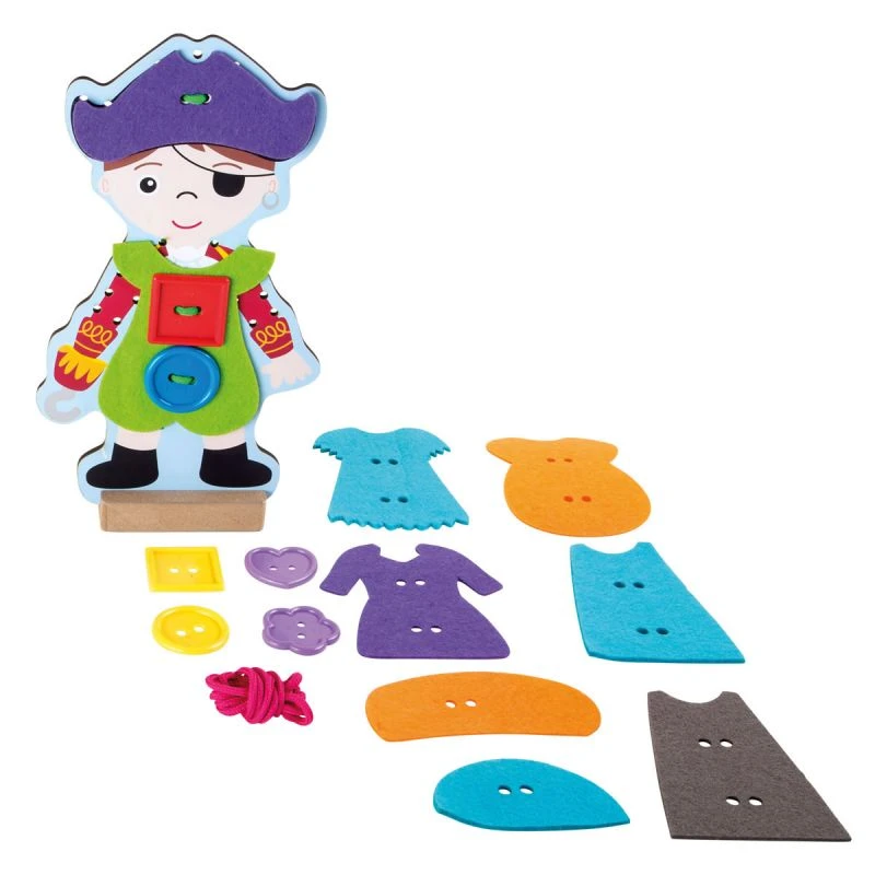 Dans ce jeu de laçage il s’agira d’habiller ce petit pirate en bois. Pour cela les enfants devront faire preuve de dextérité pour enfiler les habits de feutrine.sur le pirate. Un socle permet de maintenir le pirate debout pour l’admirer.