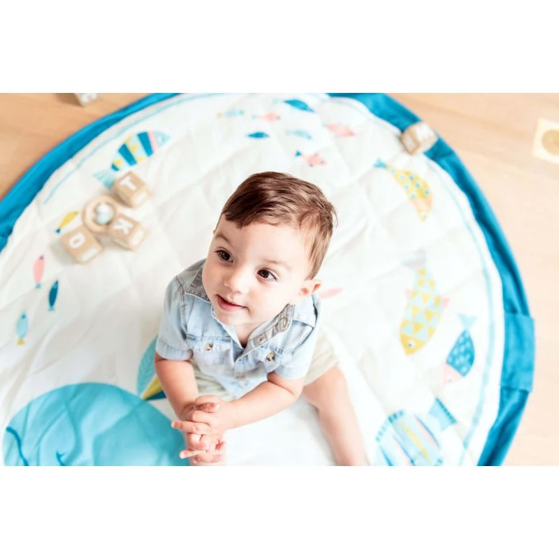 Découvrez le nouveau tapis d’éveil – sac de rangement Play and Go à l’effigie de la baleine Olga de Moulin Roty. A la fois tapis d’éveil matelassé pour bébé et sac de rangement, ce sac Play & Go aux couleurs douces est aussi joli que pratique. Ce tapis d’éveil issu de la collection soft est spécialement conçu pour les bébés avec son épaisseur de 2 cm, son diamètre de 120 cm et son système de cordes incluses dans la doublure du tapis pour le replier instantanément et le transformer ainsi en sac de rangement et de transport. Pour la sécurité de bébé, les cordes sont dissimulées sous des rabats en tissus maintenus par des boutons à pression et situé sous le tapis.