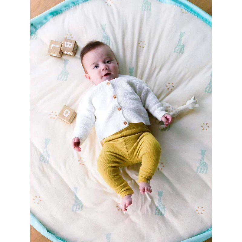 Créé en collaboration avec Sophie la girafe ce joli tapis d’éveil présente côté tapis une multitude de petites girafes et un joli vert d’eau rayé de blanc côté sac. Les couleurs sont douces et l’ensemble très délicat.