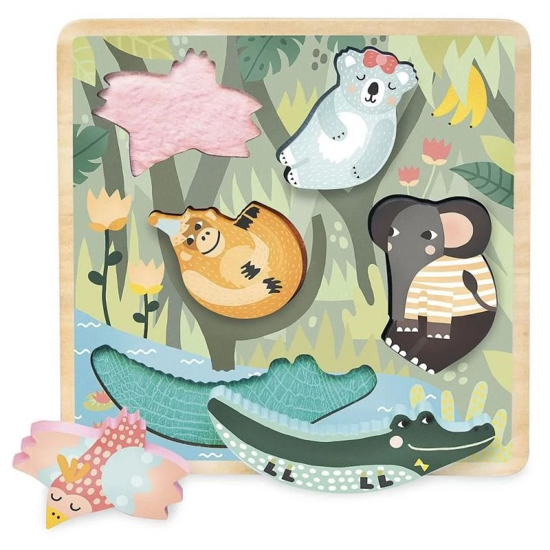 Vilac vous présente un puzzle tactile à encastrement illustré par Michelle Carlslund sur le thème des animaux de la jungle. Les textures des animaux de la jungle comme le crocodile, l’éléphant ou du panda sont à découvrir sous les pièces. Les animaux pourront également être utilisés comme des figurines pour des jeux id’imagination.